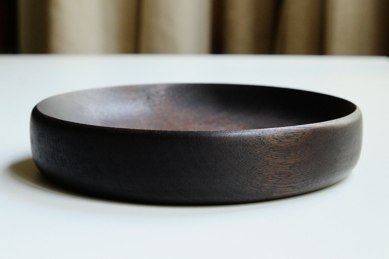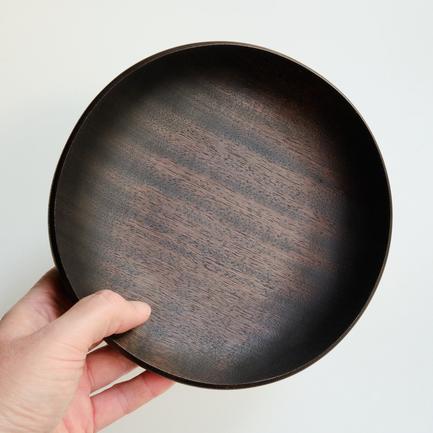 A shallow eating bowl, hand carved from sapele wood and ebonised to darken the surface. I have carved a very shallow curve into the base to reveal the original colour of the wood. Finished with three coats of danish oil.