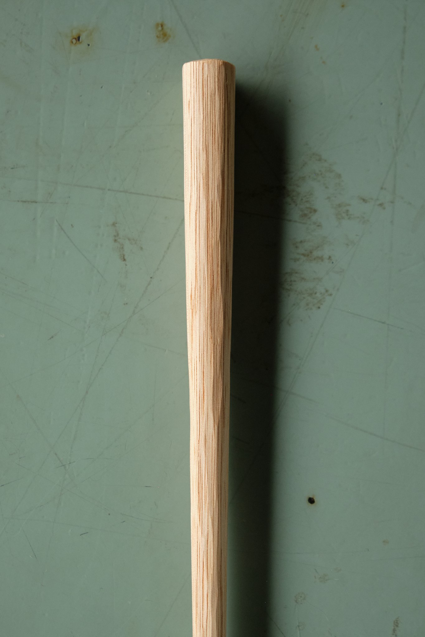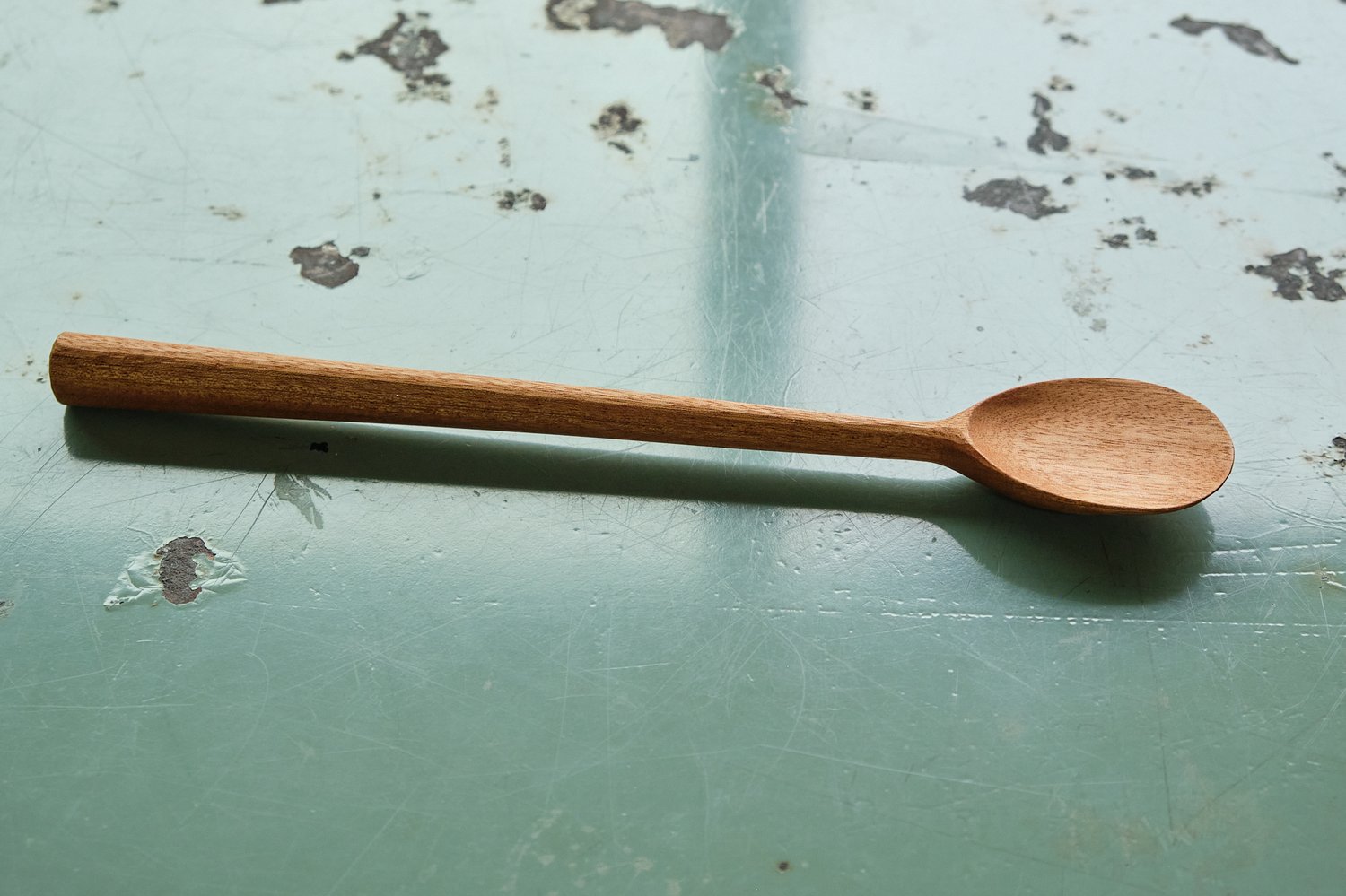 Long handled cooking spoons with a smooth (quite shallow) oval bowl. All other faces have been hand carved with a knife to create a faceted, textural surface. Currently available in two types of wood - the pale wood is Red Grandis, and the darker, red/brown wood is Sapele.