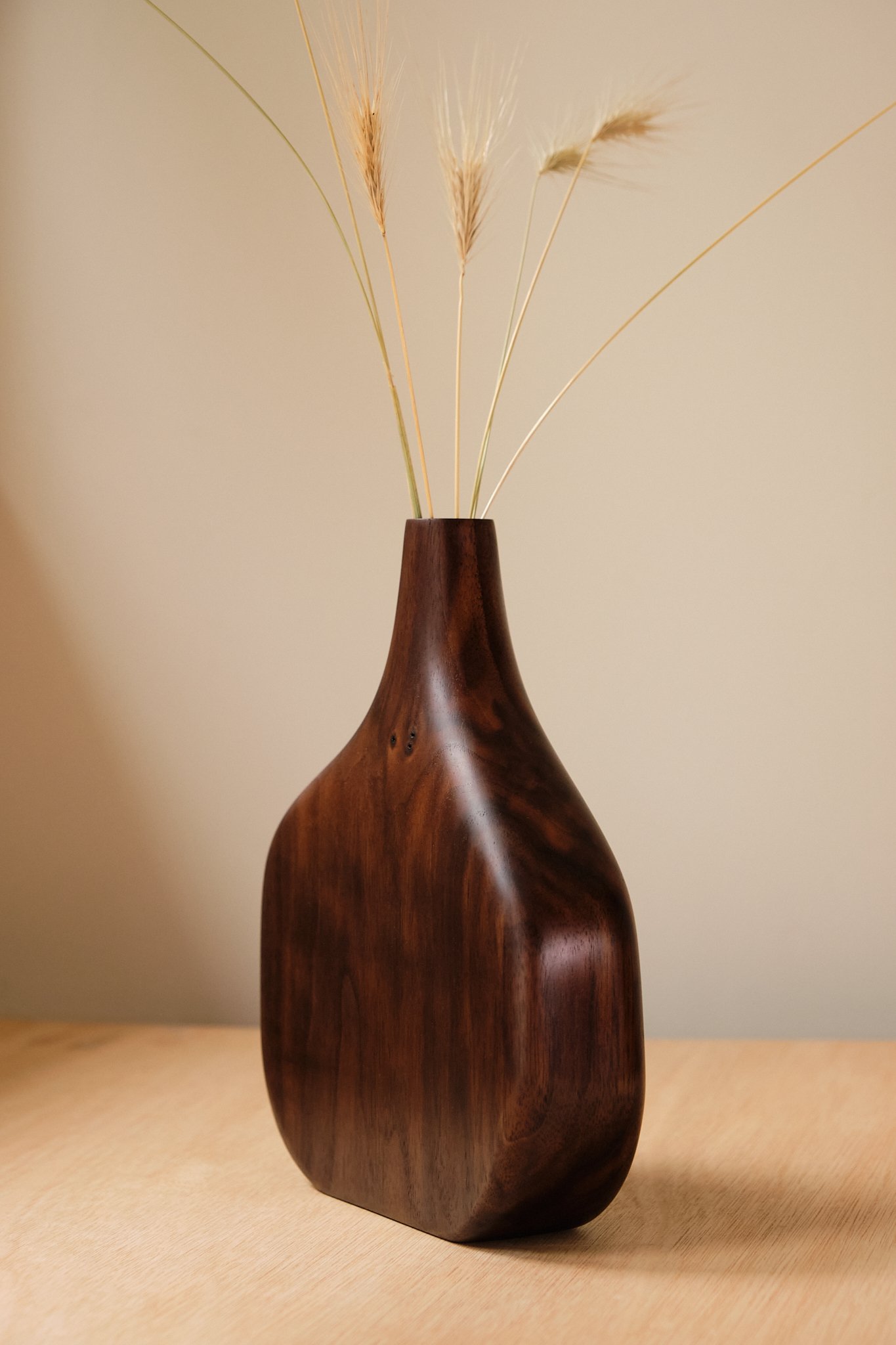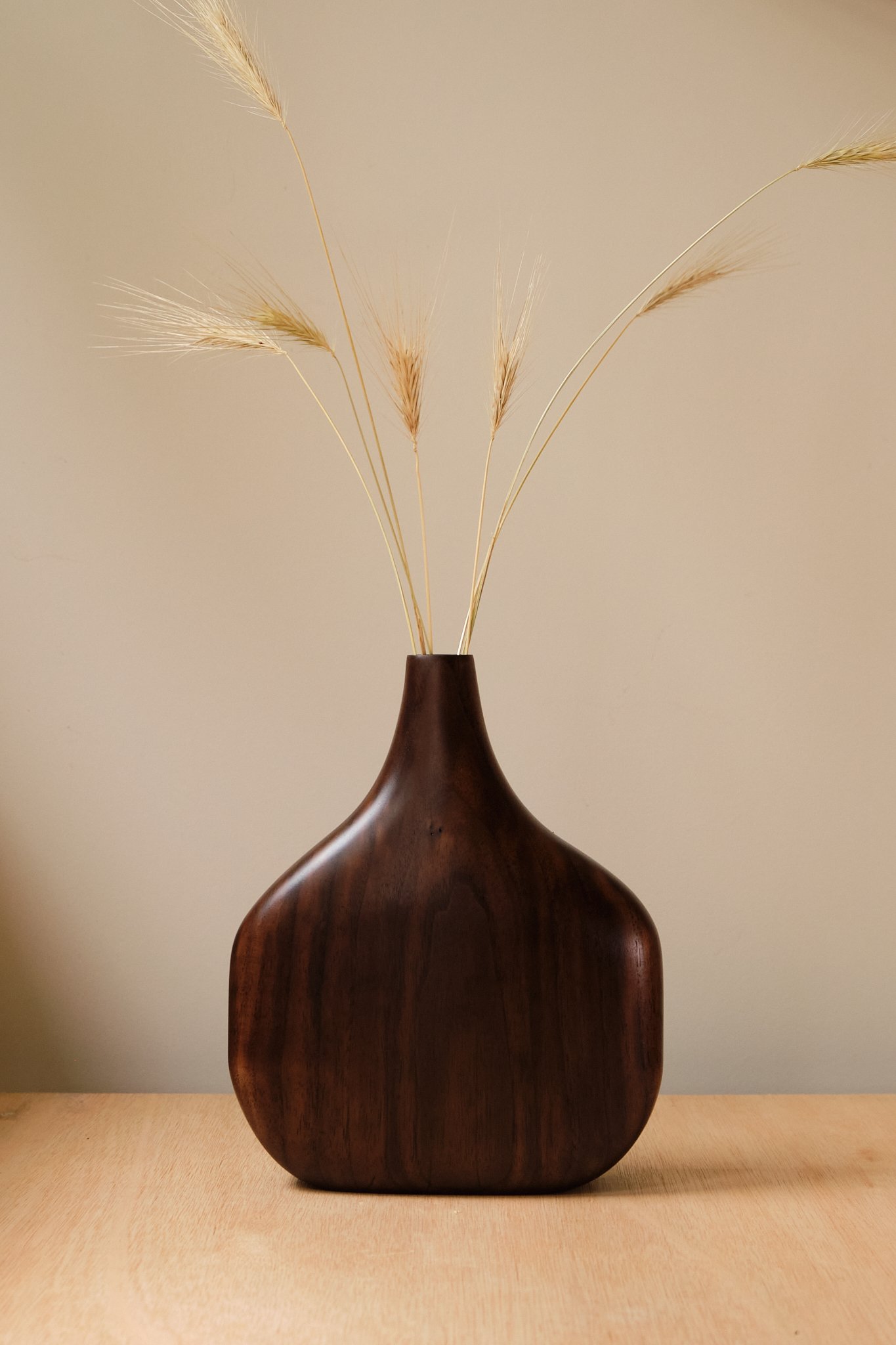 My favourite vase design so far. Definitely deserves more than the few grasses I threw into it for these pictures! Hand carved from black walnut, and finished with MANY coats of danish oil to build up a satin shine.