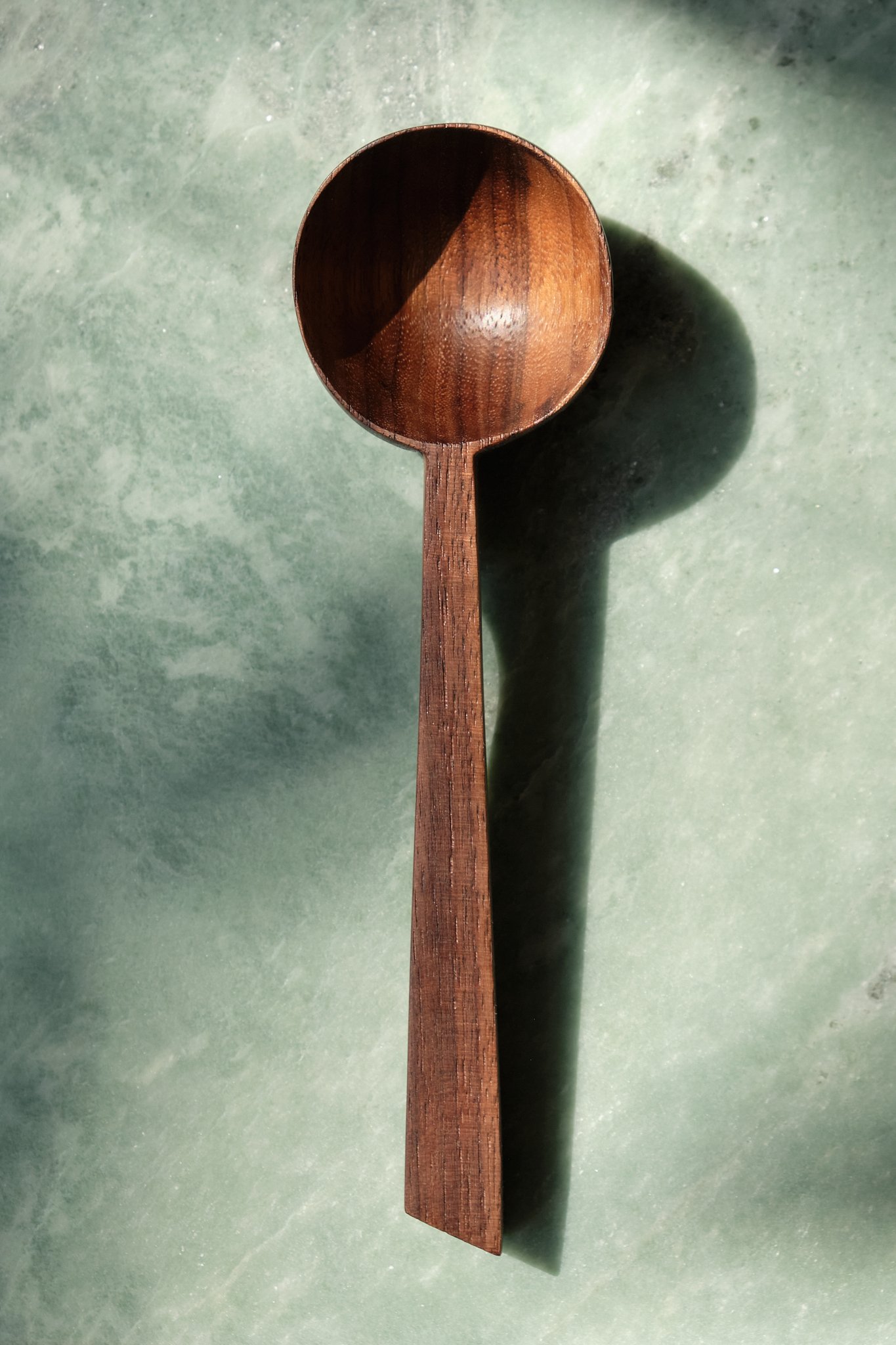 Hand carved from black walnut and finished with beeswax balm. Quite a long handle on this one - its just over 18cm long, and the bowl is 5cm across.