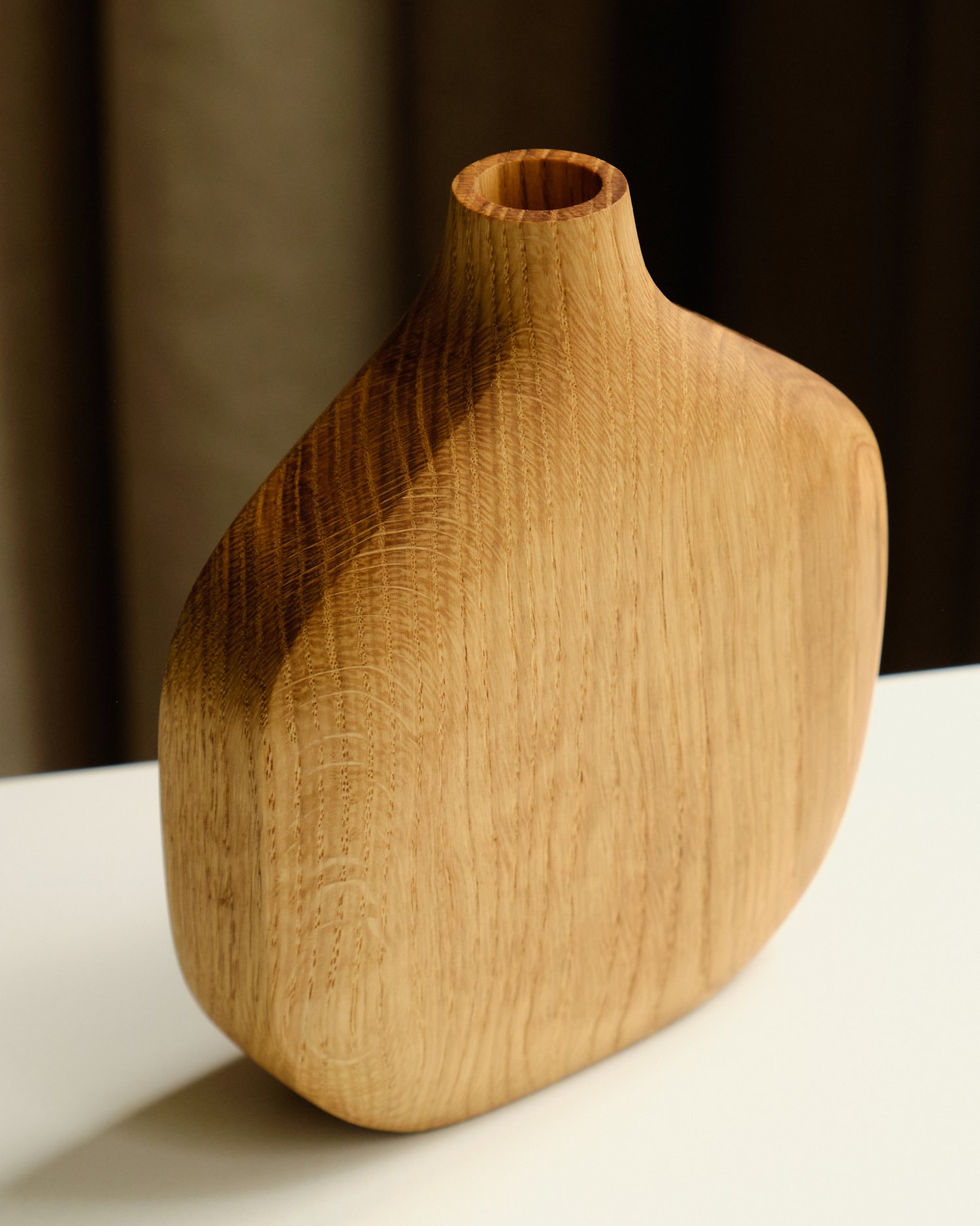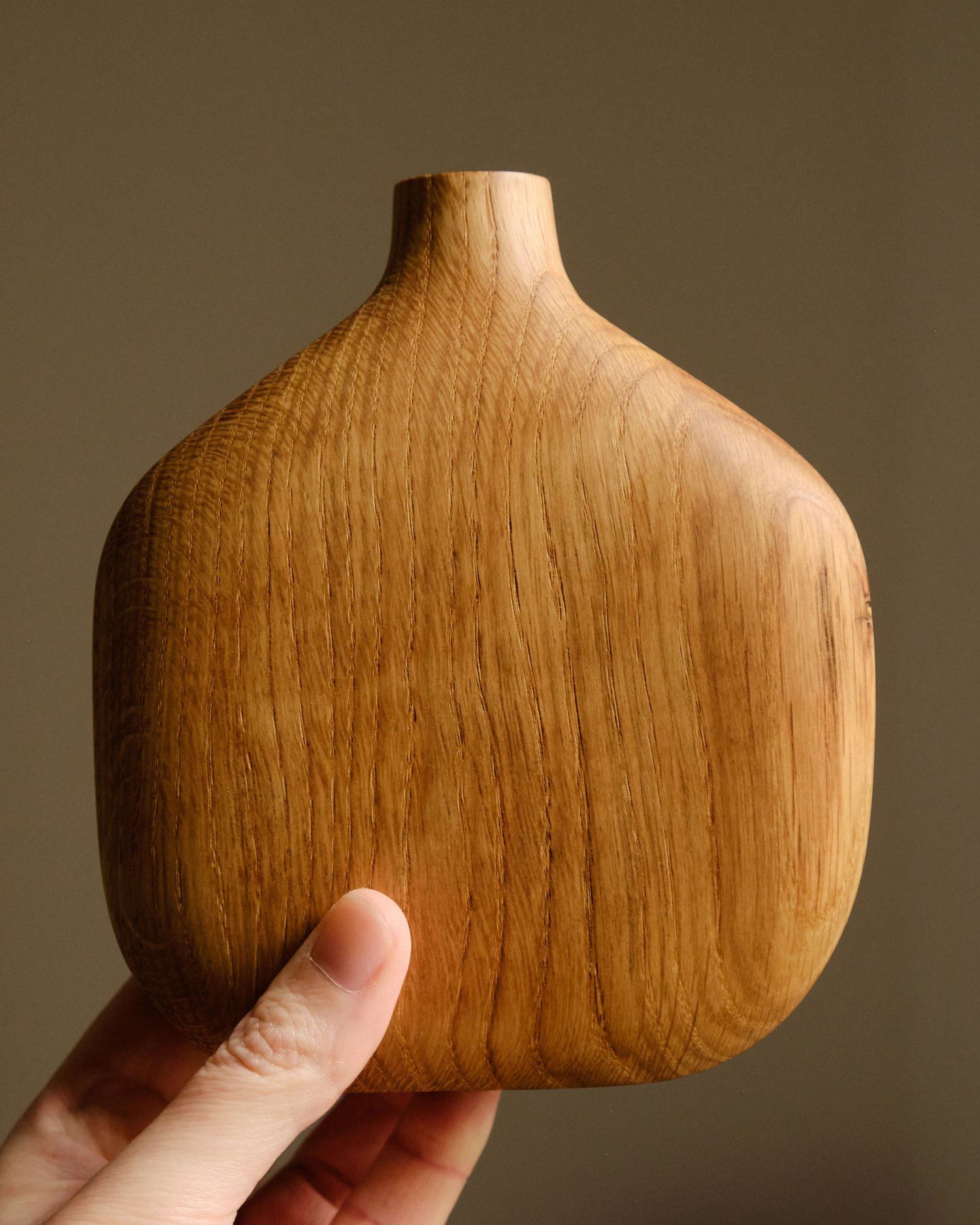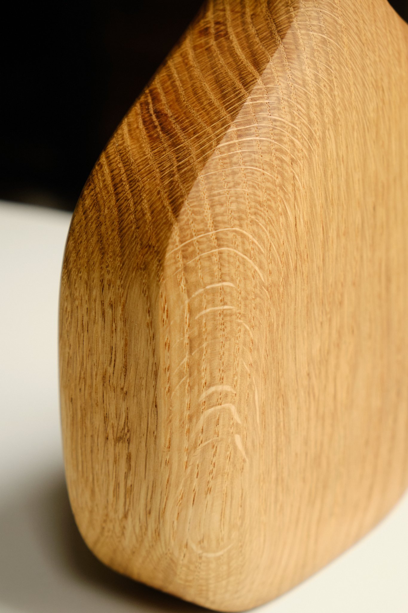 Hand carved bud vase. Oak, finished with several coats of danish oil.