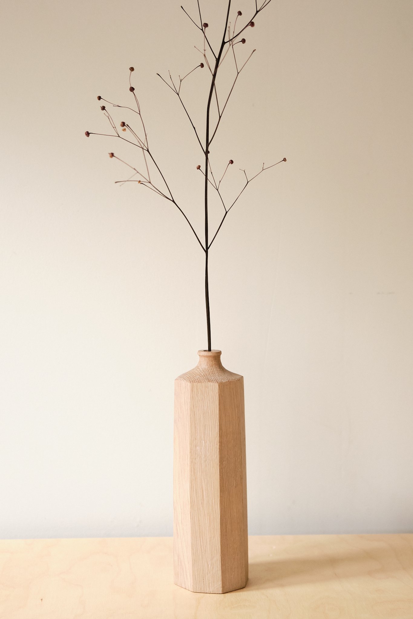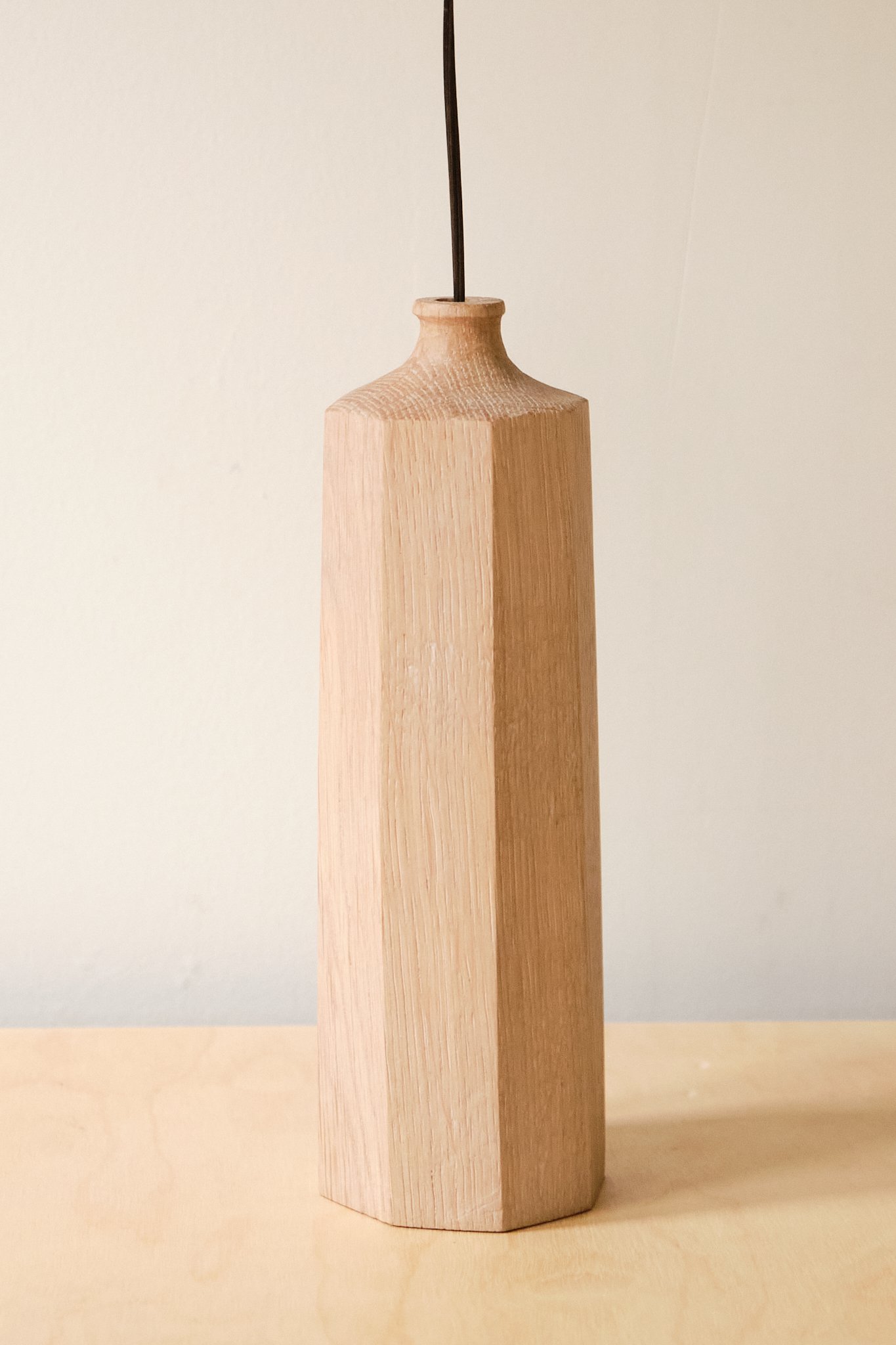 Handmade bud vase. Oak, finished with Osmo polyx oil to retain the natural light colour of the wood. This vase will take a single stem, or several skinny ones.