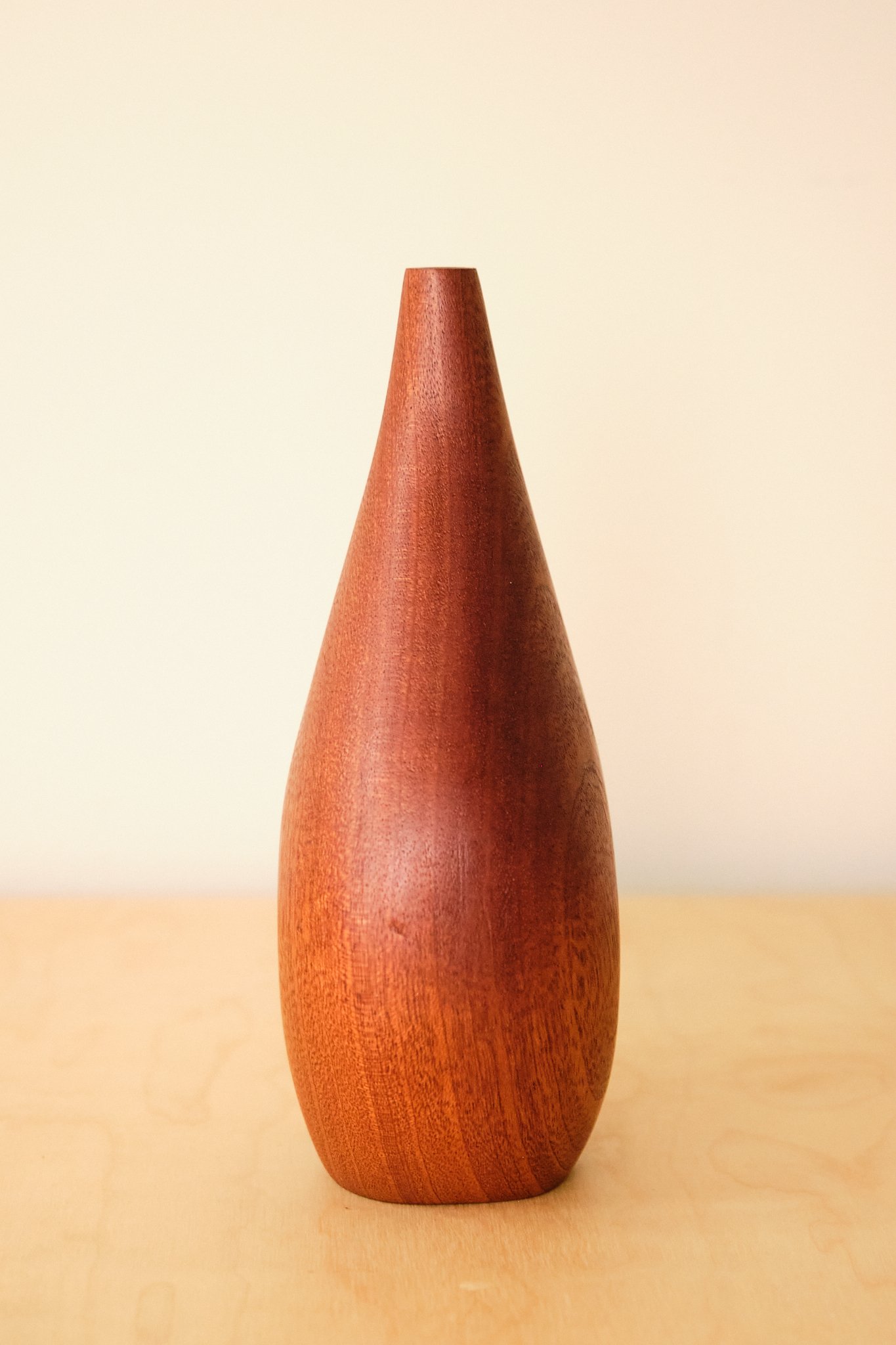 Hand carved bud vase. Lovely figured piece of sapele wood, finished with several coats of danish oil.