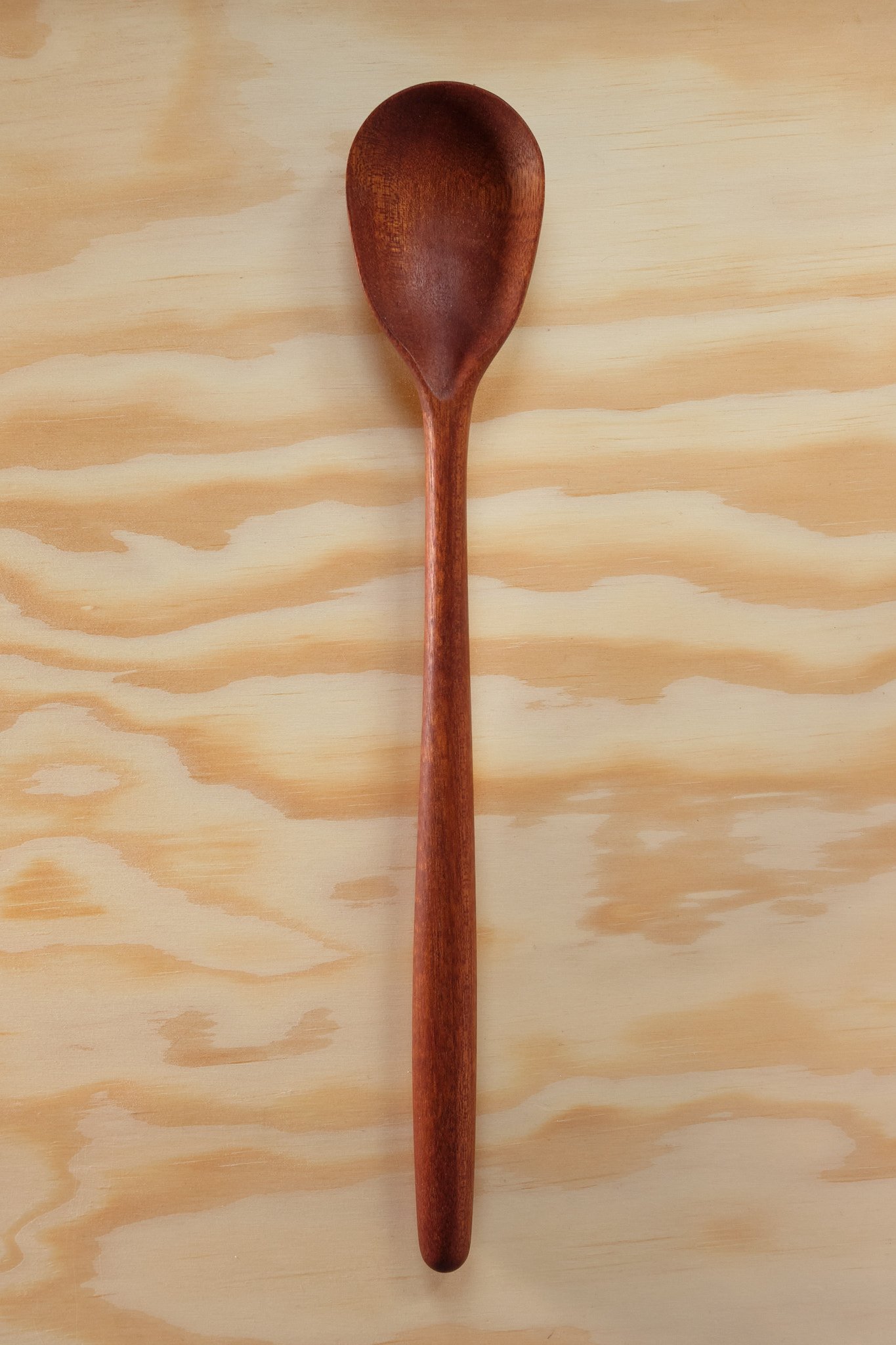 Hand carved cooking spoon. Made with sapele wood, which is a member of the mahogany family. Finished with three coats of tung oil.