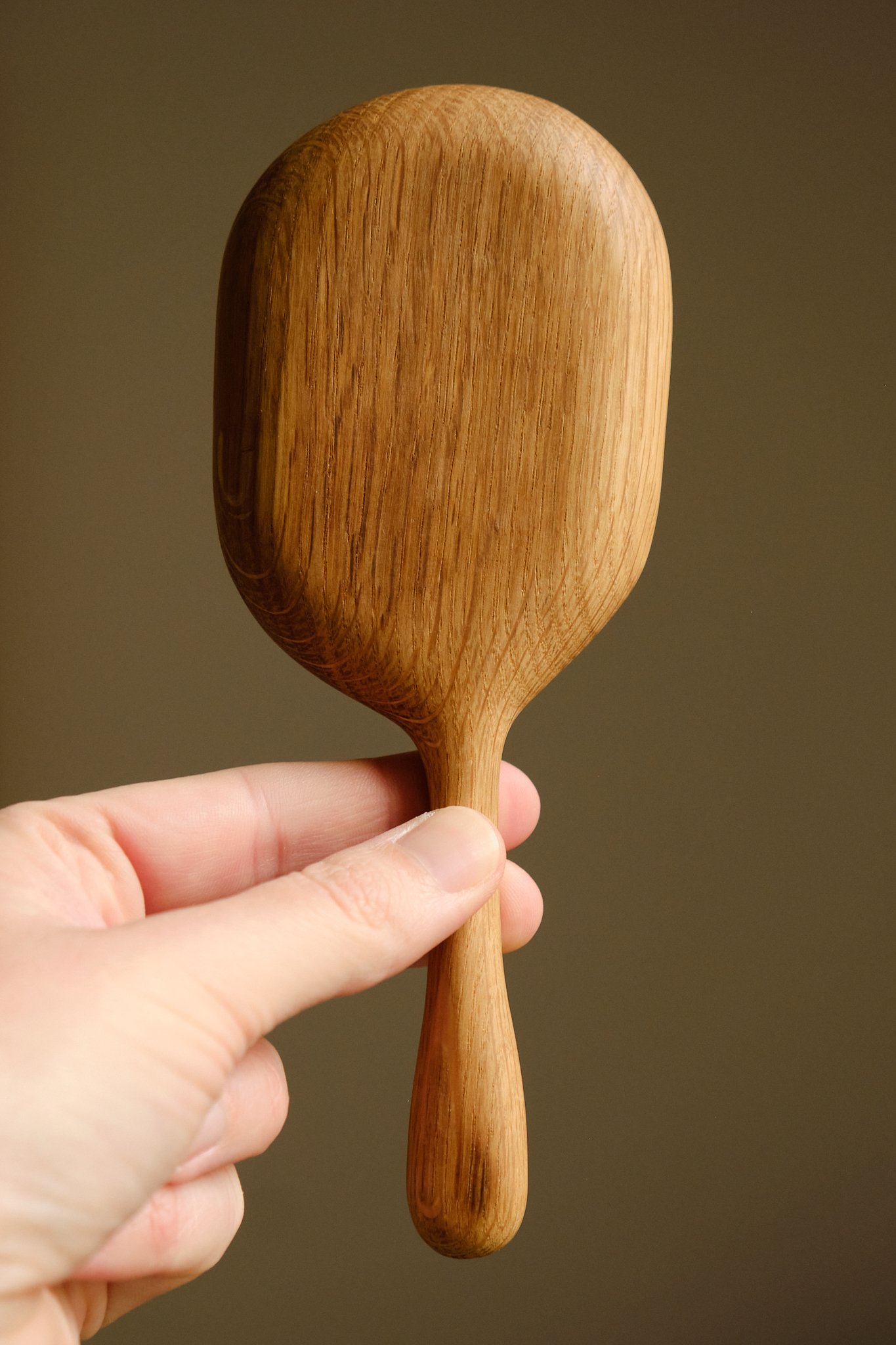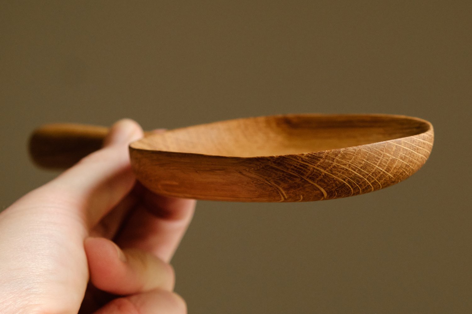 A large shallow scoop in oak. Hand carved and finished with danish oil.